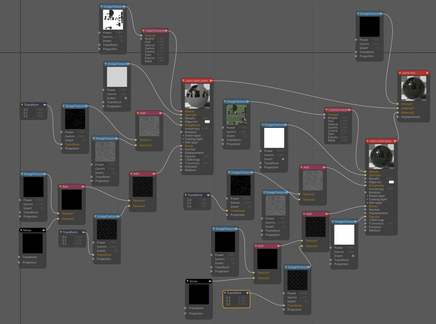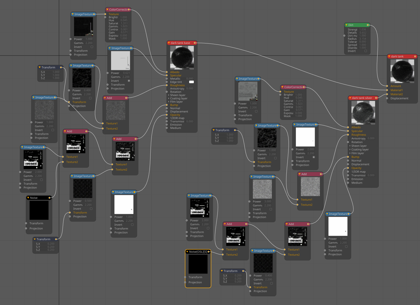 Dark tank node tree. Dirt material simulates paint wear with specular metal beneath.